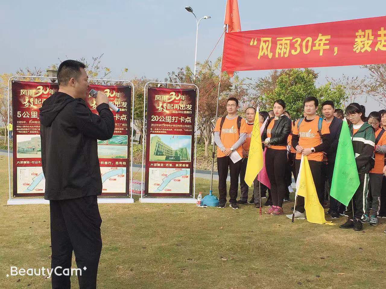 迎着朝阳,超达食品蔡加庭董事长为30周年庆毅行活动发言致辞。吹响了毅行的号角。